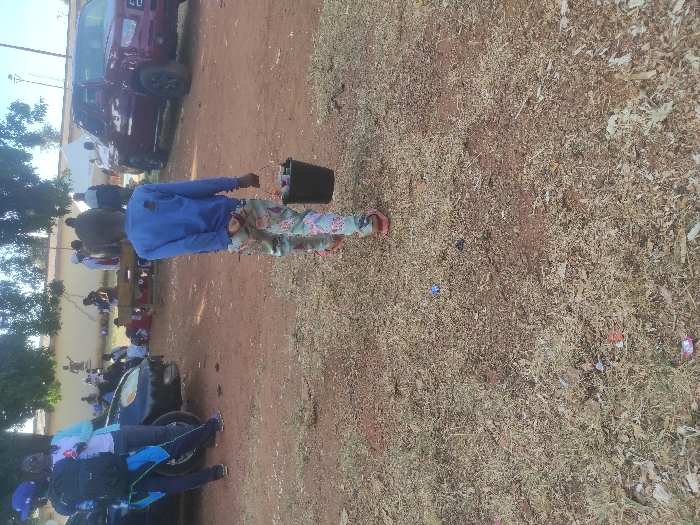 The image depicts an outdoor scene in Jos, Nigeria, on reddish-brown, dry earth. In the foreground, a child, viewed from behind, walks away from the viewer. The child wears a blue long-sleeved shirt, light-colored patterned trousers, and red sandals, carrying a dark-colored bucket filled with assorted small items in their right hand. The ground is dry, reddish-brown soil with sparse patches of dried grass and scattered litter, including small wrappers. In the midground and background, multiple individuals, vehicles, and structures are present. To the left, a dark-colored sedan is partially visible, its front bumper appearing damaged or missing. Two people stand near the sedan; one wears a blue shirt and a dark backpack, the other a white and light blue shirt. Further back on the left, under mature trees, a group of people are gathered, some seated on benches or on the ground, near a light-colored building with a dark mural depicting a human figure. To the right, a maroon pickup truck (Honda Ridgeline) is parked. Behind the truck, a white tent structure is visible, and more people are gathered. The sky is bright and clear.