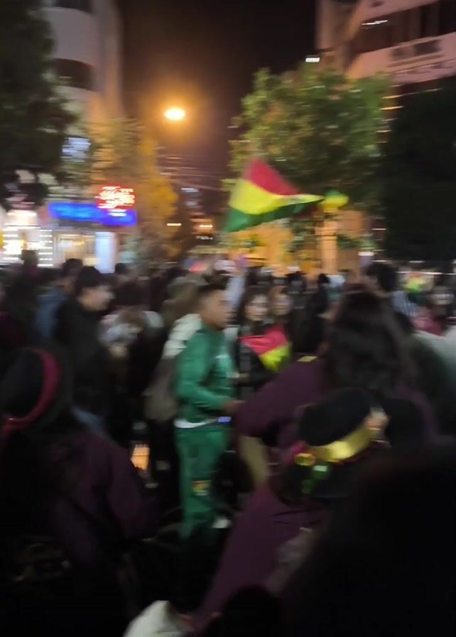 At night, a densely packed crowd is gathered on a city street, with many holding and waving the flag of Bolivia