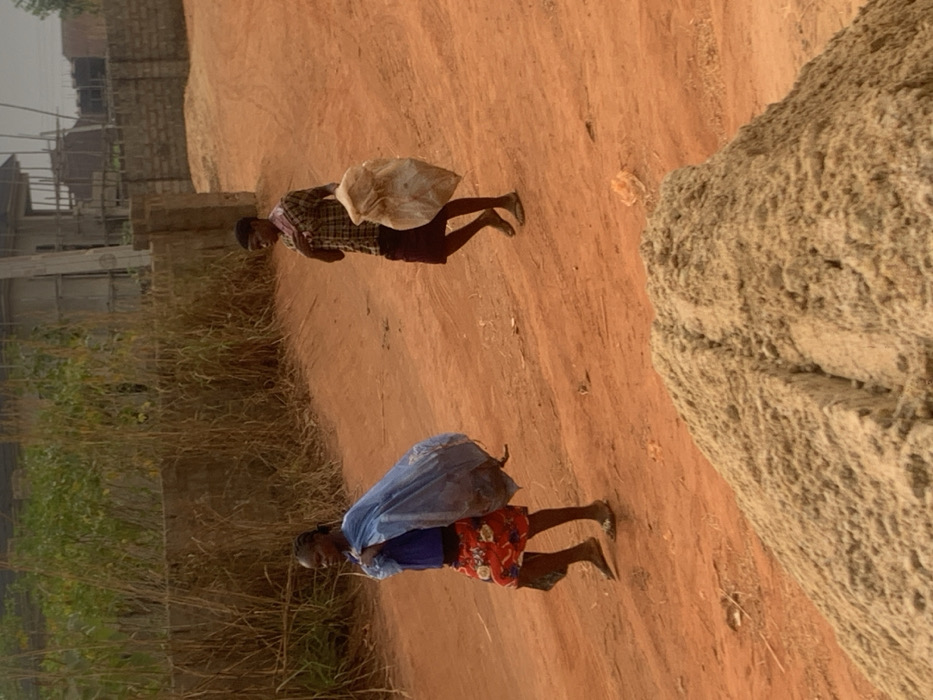 Two individuals traverse a dirt path, carrying what appear to be sacks on their backs. The path is flanked by vegetation on one side and a large, textured object on the other. One person dons a plaid shirt and dark shorts, while the other wears a blue shirt and a red floral skirt. The backdrop features buildings in varying stages of construction, under a light sky.