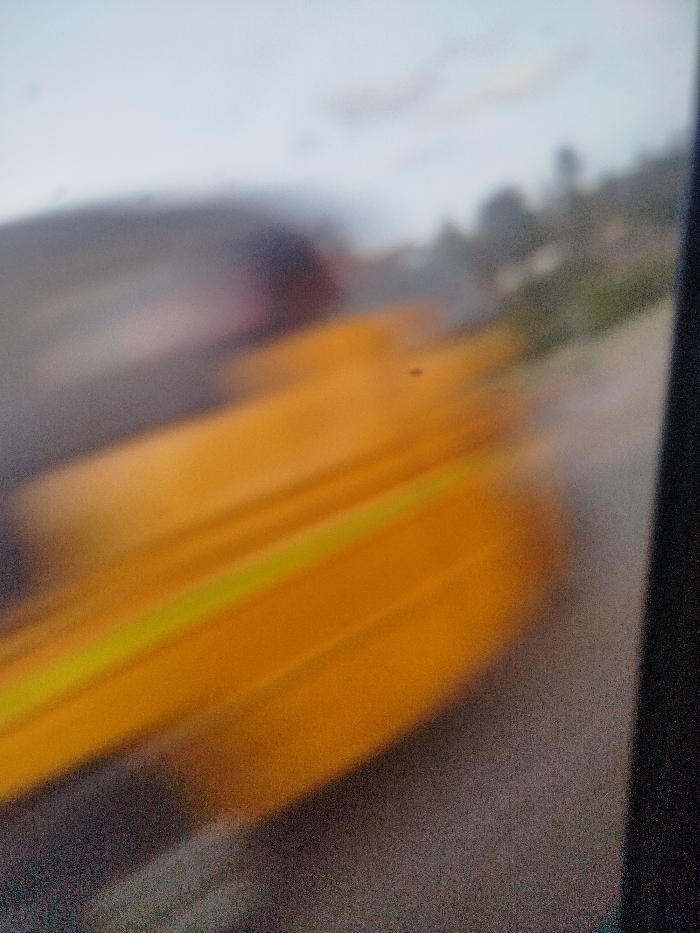 A blurry image displays a yellow object, possibly a vehicle, streaking across the frame. A landscape with green foliage and a grey sky is visible in the background. The image's focus is poor, creating a sense of rapid movement and indistinct forms. A dark vertical line appears on the right edge, potentially part of a frame or object closer to the camera.