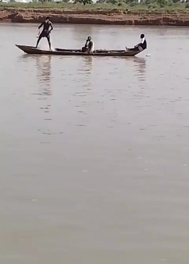 three people in a long, narrow boat on a body of water, possibly a river. The person at the front is standing and appears to be throwing something into the water. The person in the middle is sitting, while the person at the back is reclining. The riverbank is visible in the background with some sparse vegetation. The sky is overcast.