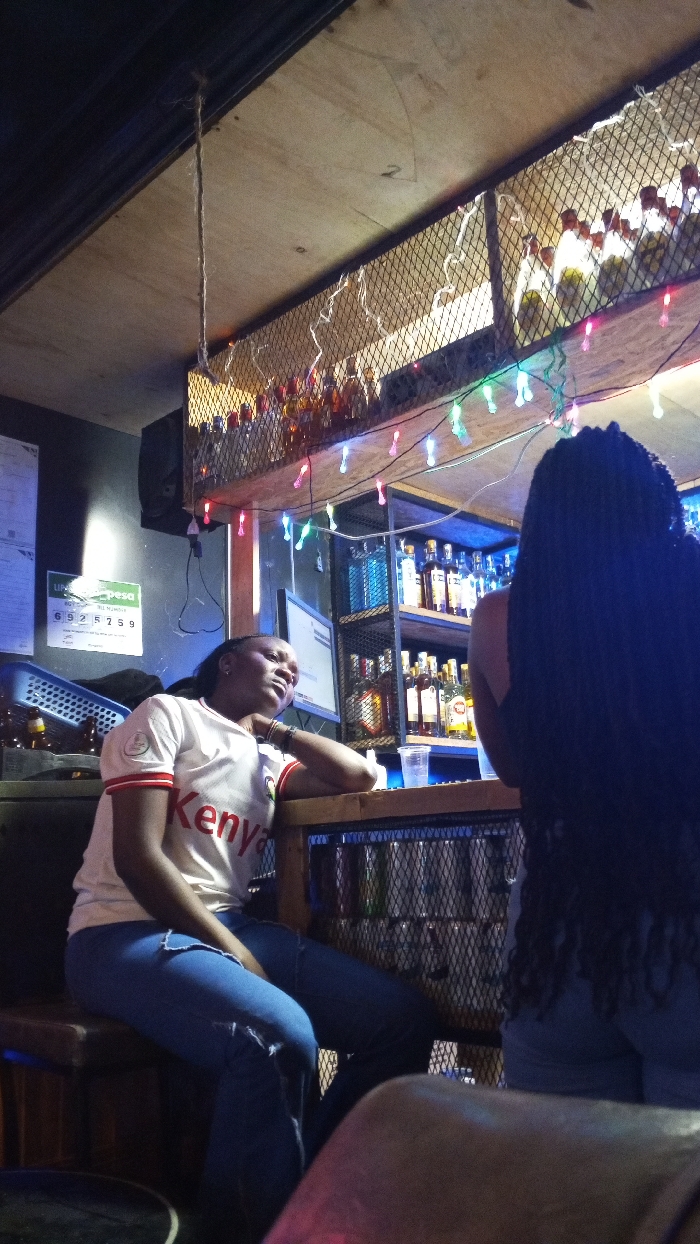 Inside a dimly lit bar, a woman in a white "Kenya" t-shirt and blue jeans sits pensively at the counter