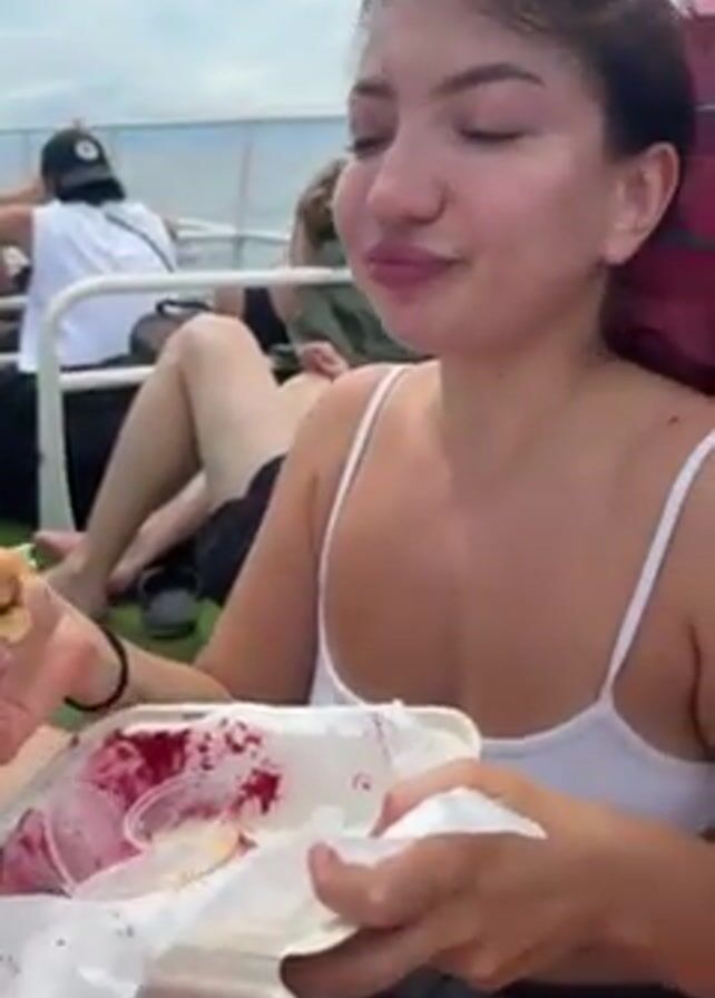 A young woman with dark hair is seated on a boat. She's wearing a white tank top and holds a white takeaway container filled with what appears to be a messy mix of food, including a crepe or pancake and some kind of red sauce or puree. She takes a large bite of the rolled pancake, chews, and swallows with evident enjoyment. Other passengers are visible in the background, some seated and some lying down. The sky is overcast.