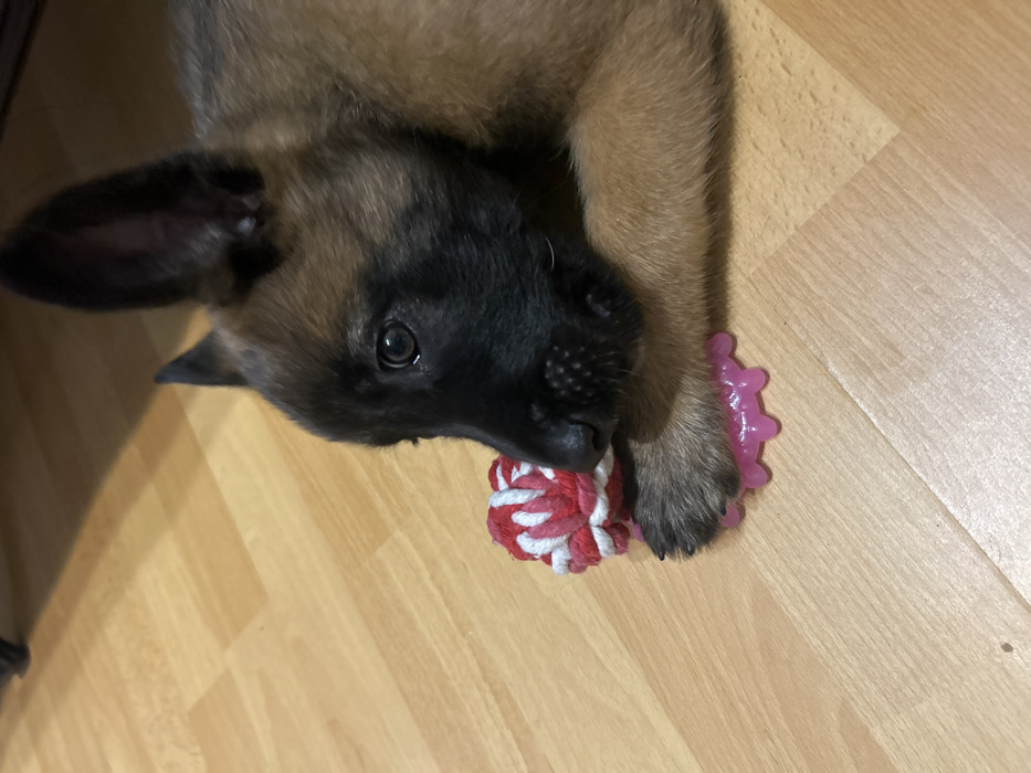 - "A brown and black puppy is observed indoors in the city of Hrabarsko, Bulgaria, lying on a light-colored wooden floor" by FM-sT5Bj1, licensed under CC BY 4.0