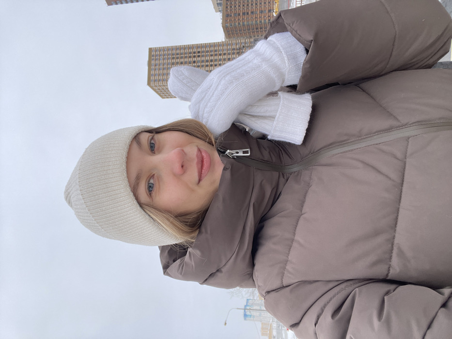 A woman with blonde hair and blue eyes poses for a selfie. She wears a light beige beanie and a brown puffer jacket. White mittens are crossed in front of her chest. Tall buildings are visible in the background against a gray sky. The scene appears to be outdoors, likely in a city during the winter.
