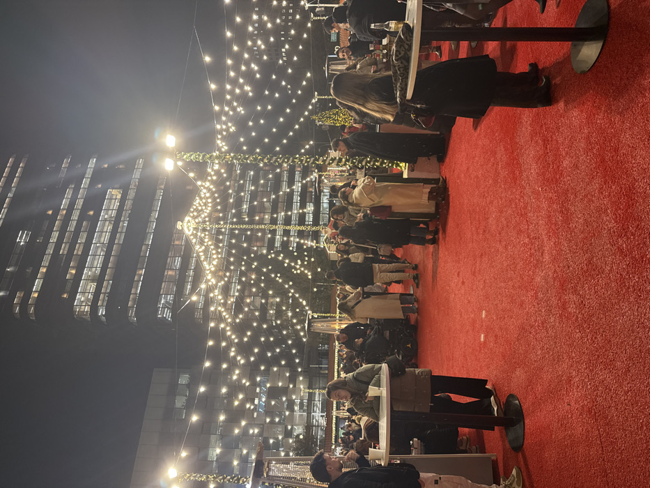 A nighttime scene shows a crowd of people on a red-carpeted area, possibly at an event. Many are standing in a line under strings of lights. Several tall tables are scattered about, with individuals or small groups conversing around them. In the background, a tall building with many windows is visible against the night sky. The atmosphere is lively and festive.