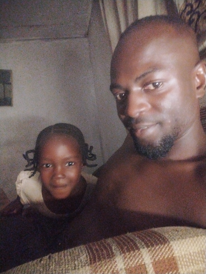 This image depicts an indoor scene in Akwanga, Nigeria, featuring an adult male and a young child. The adult male, positioned on the right, has dark skin, a shaved head, and a short, dark beard. He is bare-chested and looks directly at the camera. A young child with dark skin, styled hair in two pigtails, and wearing a dark top, is positioned behind and to the left of the male, also looking at the camera with a slight smile. The foreground shows a plaid blanket or fabric with light and dark brown squares. The background consists of a light-colored wall with a small, dark, rectangular object on the left, and vertically striped fabric partially visible in the upper right. The lighting is dim, resulting in a grainy image.
