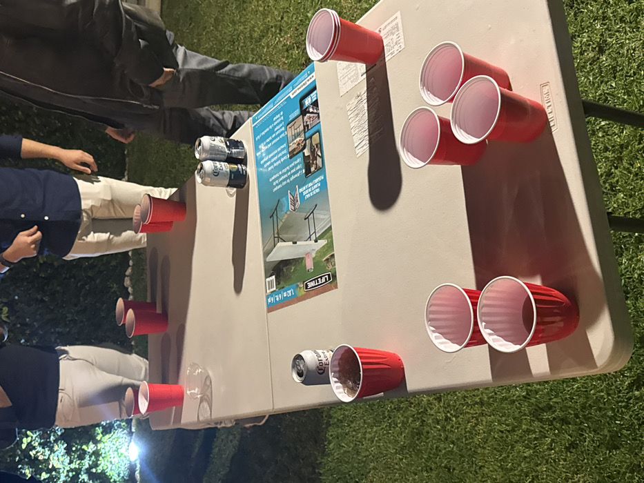The image displays an outdoor nighttime scene in San Bernardino Tlaxcalancingo, Mexico. Three individuals are partially visible, standing around a light-colored folding table situated on green grass. A bright artificial light source, located to the left, illuminates the immediate area and casts distinct shadows across the table. Dark green foliage is visible in the background. The table features multiple red plastic cups, arranged in patterns consistent with the game of beer pong: three triangular clusters of three cups are positioned towards the far end of the table. In the foreground, an additional five empty red cups are present. One red cup near the foreground left contains a dark liquid with ice, placed next to an open silver "Corona Extra" beer can. Two unopened "Corona Extra" beer cans are centrally located on the table. A clear, small glass dish is also visible on the left side of the table, and a blue "Lifetime" brand folding table packaging is laid flat across a central section of the table surface. The individuals are visible from approximately the torso down. Two persons are wearing dark blue long-sleeved shirts and light-colored pants. The third individual, on the far right, is dressed in a black jacket and dark gray pants. Their hands are visible near their bodies and the table.