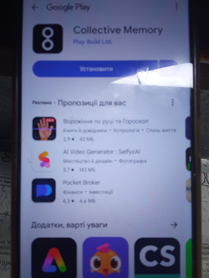 The image is a screenshot of a Google Play Store app on a smartphone displaying the "Collective Memory" app. The phone is positioned vertically with the camera pointed directly at the screen. The screen displays a list of apps for download. At the top of the screen is the Google Play logo, followed by the app name "Collective Memory" and a blue button labeled "Установити" in Cyrillic script, likely meaning "Install" in Ukrainian. Below that is a section labeled "Рекомендації - Пропозиції для вас" in Cyrillic script, meaning "Recommendations - Suggestions for you" in Ukrainian. Below this section is a list of three apps with their icons, names, descriptions, and ratings. The icons for the apps are a hand with two lines on it, a stylized letter S, and a stylized letter D. The names of the apps are "Ворoжiння по руці та гороскоп", "AI Video Generator: SelfyzAI", and "Pocket Broker". Below this section is another section labeled "Додаткі, варті уваги" in Cyrillic script, meaning "Additional, worth attention" in Ukrainian, and a list of three apps with their icons, names, and ratings. The icons for the apps are a stylized letter A, a cartoon yellow chick with a pink hat, and the letters CS. The smartphone is in the city of Bila Tserkva, Ukraine, located at the given latitude and longitude.