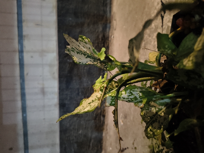 The image displays an ornamental plant, likely a *Dieffenbachia* or similar species, located in Tarqumiyah, Palestinian Territory. The plant, centered in the frame, features multiple broad, variegated leaves exhibiting a pattern of green and white or cream-colored mottling. Some leaves show minor imperfections or irregular edges. The plant stems emerge from a dark, partially visible container at the bottom of the frame. In the background, a dark, textured surface is visible behind the plant, transitioning upwards into a lighter-colored wall composed of rectangular panels or tiles, bisected horizontally by a distinct blue stripe. The scene is under dim, ambient lighting, illuminating the plant and the upper background wall more prominently. No individuals, actions, or specific interactions are depicted.