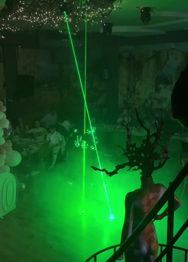 dimly lit room illuminated by green laser beams cutting through artificial fog. The room appears to be a restaurant or a bar, with tables occupied by people in the background. In the foreground, a dark spiral staircase leads up, and a nude mannequin with tree branches for a head stands next to it. Above, the ceiling is decorated with branches and small white lights. A figure in an LED suit stands in the midst of the laser beams. Music plays in the background.