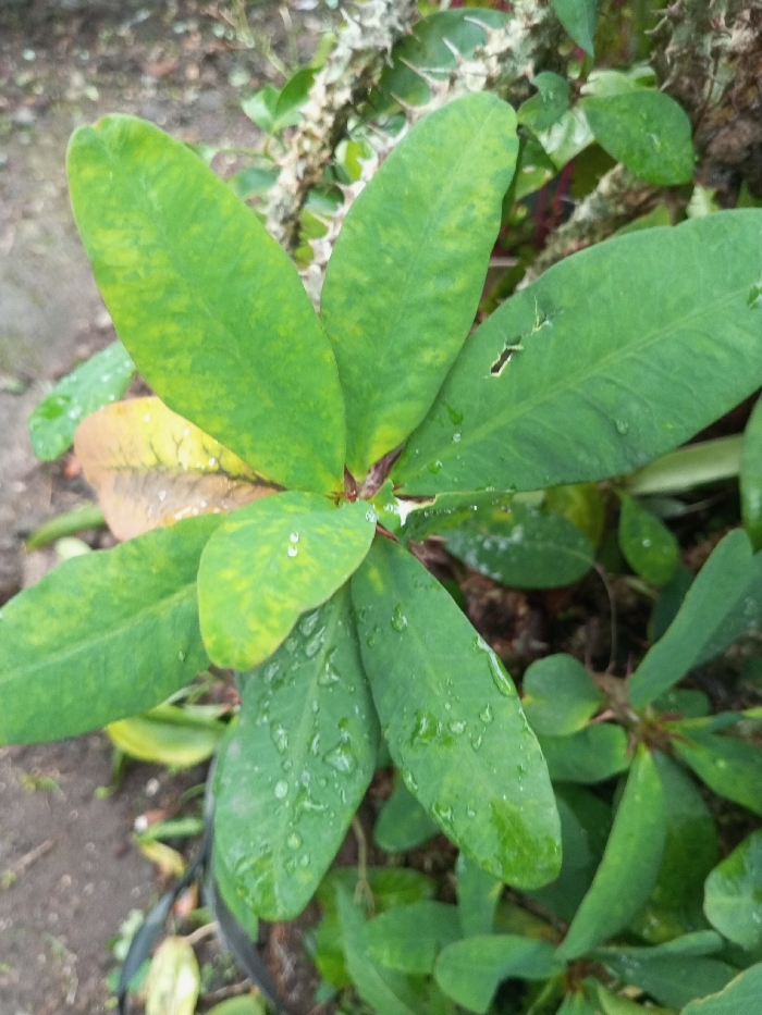 An overhead view captures a section of a plant, likely a succulent, situated in Kotakonda, India. The plant features numerous ovate-lanceolate leaves, primarily green with distinct yellow-green variegation or chlorotic patterning. Several leaves, particularly in the lower central and right areas, are covered with small, clear water droplets. One leaf in the upper right exhibits two irregular tears. A lower leaf on the left displays a more pronounced yellow-brown discoloration. The plant's central stems appear reddish-brown. The immediate foreground shows dark, moist soil, with the rim of a dark pot visible in the lower left. The background features blurred green foliage and hints of a lighter, textured surface, possibly another plant or a moss-covered substrate. No individuals, animals, or explicit actions are depicted.