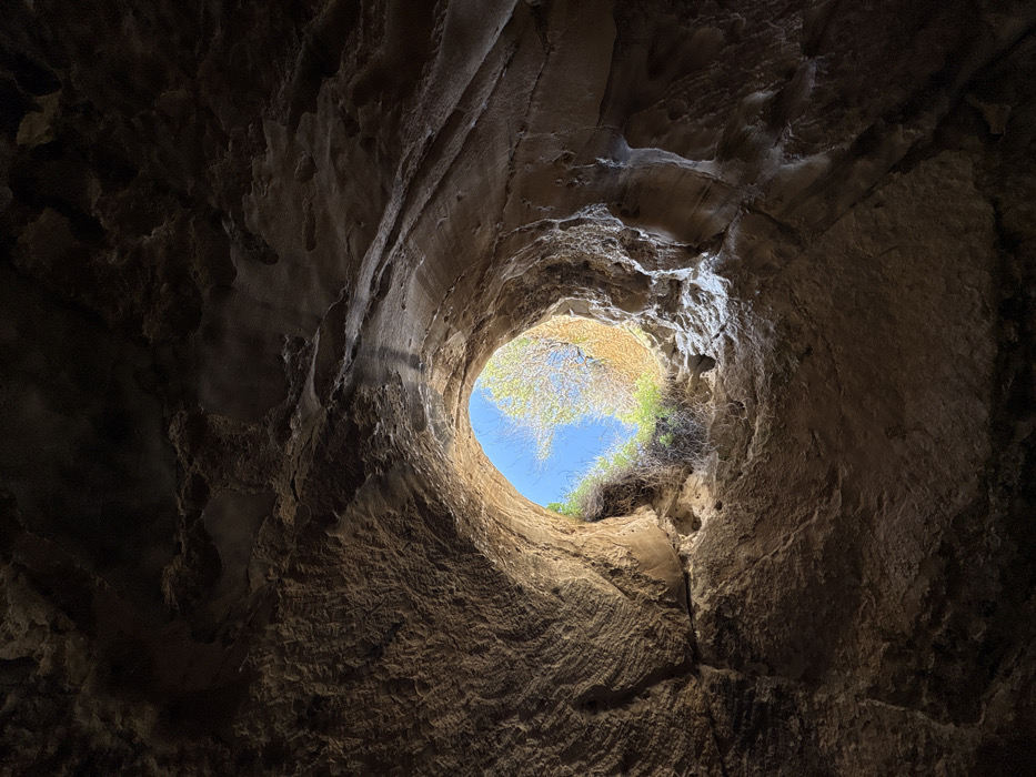 - "The image depicts an interior view of a rock-hewn chamber or cave, looking directly upwards towards a circular to oval opening in the ceiling" by FM-WxcAf2, licensed under CC BY 4.0