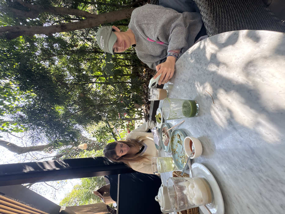 Two women sit at a marble table outdoors surrounded by lush trees. The table is cluttered with half-eaten meals, empty glasses, and small plates. One woman wears a grey sweater and a baseball cap, focused on pouring something into a glass. The other woman wears a light-colored sweater and looks forward. The scene is bathed in natural sunlight.