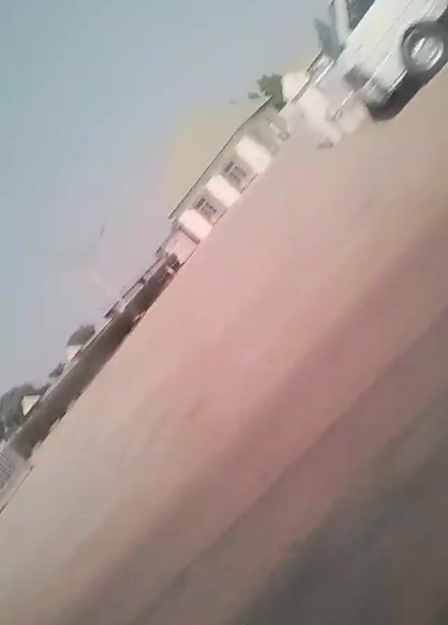 moving vehicle driving on a paved road near what appears to be a dirt hillside. Other vehicles, including a small white truck, are visible on the road. Buildings and power lines are also visible in the background. The video seems to be recorded from within another moving vehicle. The camera angle is skewed, and there is some shakiness. A logo "SHOT ON P6S_" is displayed on the screen. There's some talking in an African language in the background.