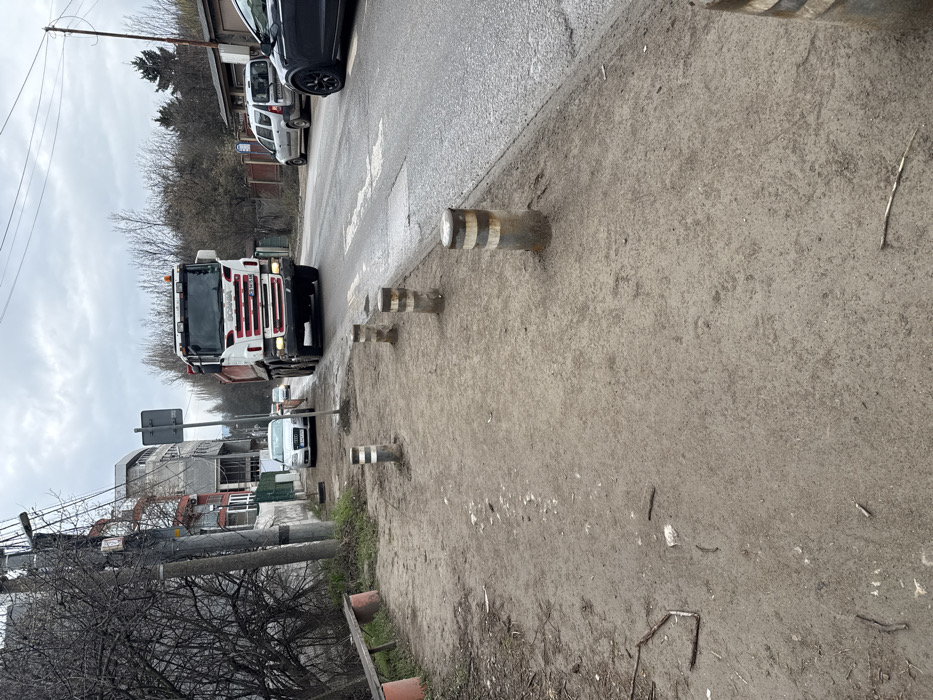 The image displays an urban street scene in Sofia, Bulgaria, under an overcast sky, viewed from a low angle on an unpaved pedestrian path. In the immediate foreground, a wide, compacted dirt and gravel sidewalk stretches across the frame, littered with small sticks and scattered debris. Five weathered, cylindrical bollards, approximately 0.5 meters tall, line the right edge of the sidewalk, each marked with faded horizontal white and dark bands. To the far left, a simple wooden bench with red-orange concrete supports rests amidst bare vegetation. The midground is dominated by an asphalt road running parallel to the sidewalk. A white and red Scania dump truck, bearing a Bulgarian "CB" license plate, occupies the nearest lane, traveling towards the viewer. A white arrow indicating direction is painted on the road surface beneath the truck. To the left of the road, a silver Audi A6 sedan with a Bulgarian "CB" license plate (CB 3946 HT) is parked on a dirt verge adjacent to a building. Further down the road, a white Dacia Logan van and a dark grey sedan are partially visible. The background comprises a mix of urban infrastructure and natural elements. On the left, multi-story buildings with varied facades (including red and grey sections) are seen behind fences. On the right, bare deciduous trees and smaller structures, possibly garages, line the road. Utility poles with overhead wires are visible along the left side of the street. The sky is uniformly grey and overcast. No individuals are present in the visible scene.