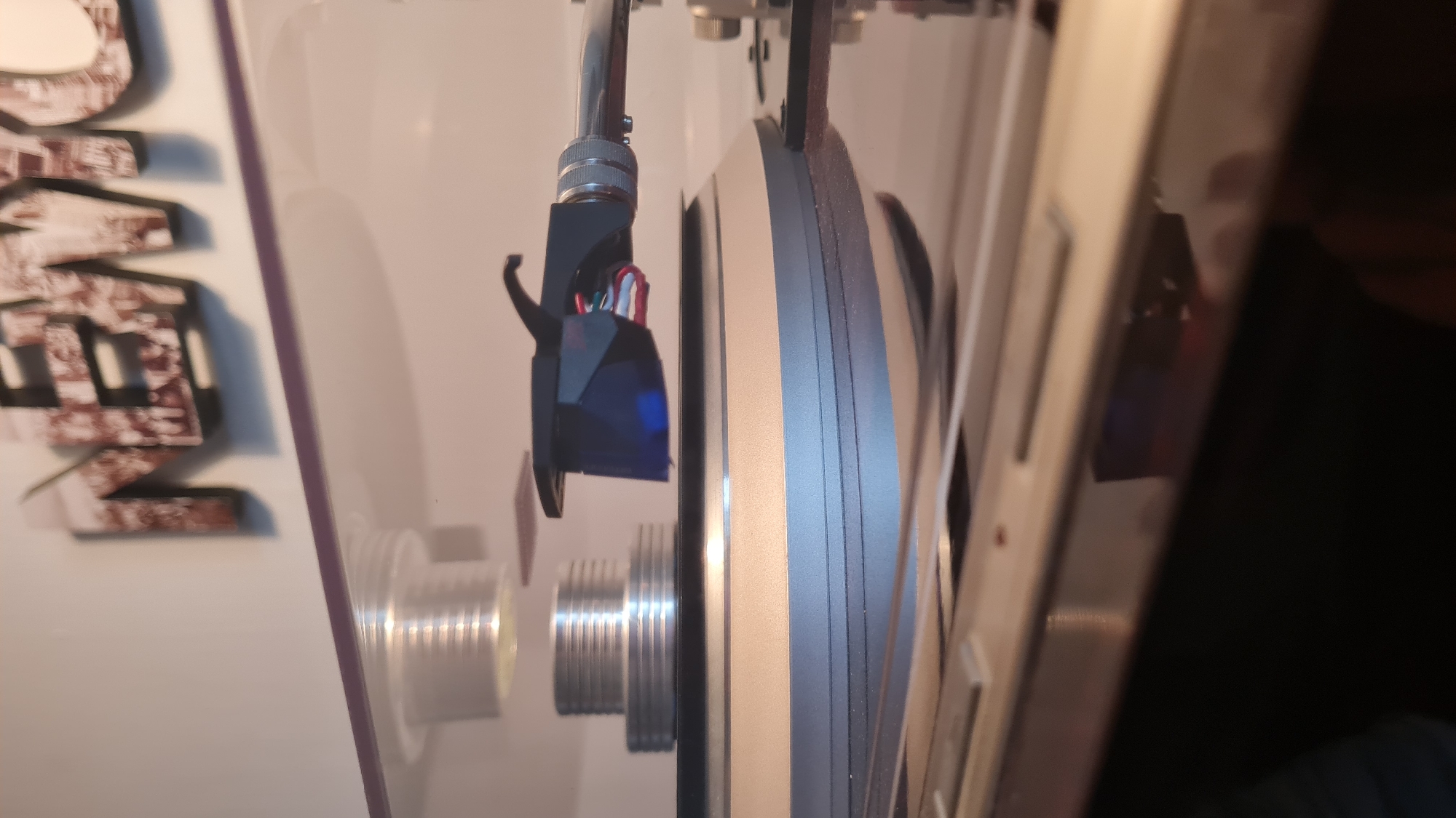 The image displays an indoor, close-up perspective of a turntable system situated in the Lachish Regional Council, Israel. In the central and lower-mid portion of the frame, a silver-toned, multi-tiered turntable platter is visible. Positioned above the platter, a metallic, grooved record clamp or spindle is present, accompanied by a smaller, similar cylindrical object slightly to its left. Extending from the right side, a metallic tonearm culminates in a dark blue or black phono cartridge. The cartridge features visible red, white, blue, and green connecting wires at its rear. This cartridge is poised above the platter, indicating a state of readiness or pause, and is not engaged with a record. A transparent, purple-tinted dust cover edge horizontally bisects the upper mid-ground. The background reveals a light-colored wall with large, three-dimensional letters, out of focus, that appear to spell "NEMO." These letters exhibit a textured, brownish surface, consistent with being composed of numerous small images or patterns. The foreground is dark and unfocused, showing reflections from the turntable's underside. No individuals or active interactions are visible in the scene.