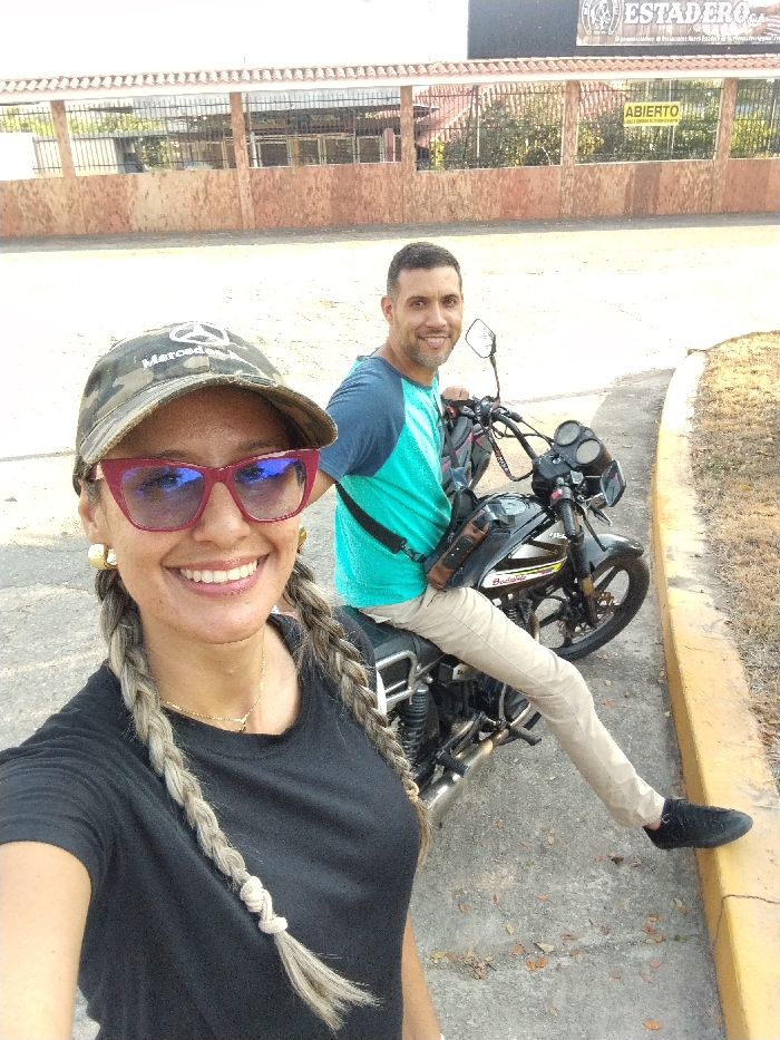 A selfie shows a smiling woman wearing a baseball cap and pink-framed glasses. She has long braided hair and gold earrings. Behind her, a man sits on a motorcycle. He wears a blue and green shirt and tan pants. The motorcycle is black with chrome accents. A sign reading "ESTADERO" and "ABIERTO" is visible in the background. The scene is outdoors on a paved surface next to a curb.