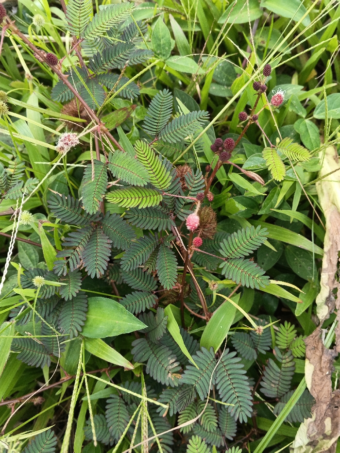 - "The image displays a close-up, top-down view of a *Mimosa pudica* plant (touch-me-not) growing amidst dense green foliage" by FM-yZ8M83, licensed under CC BY 4.0