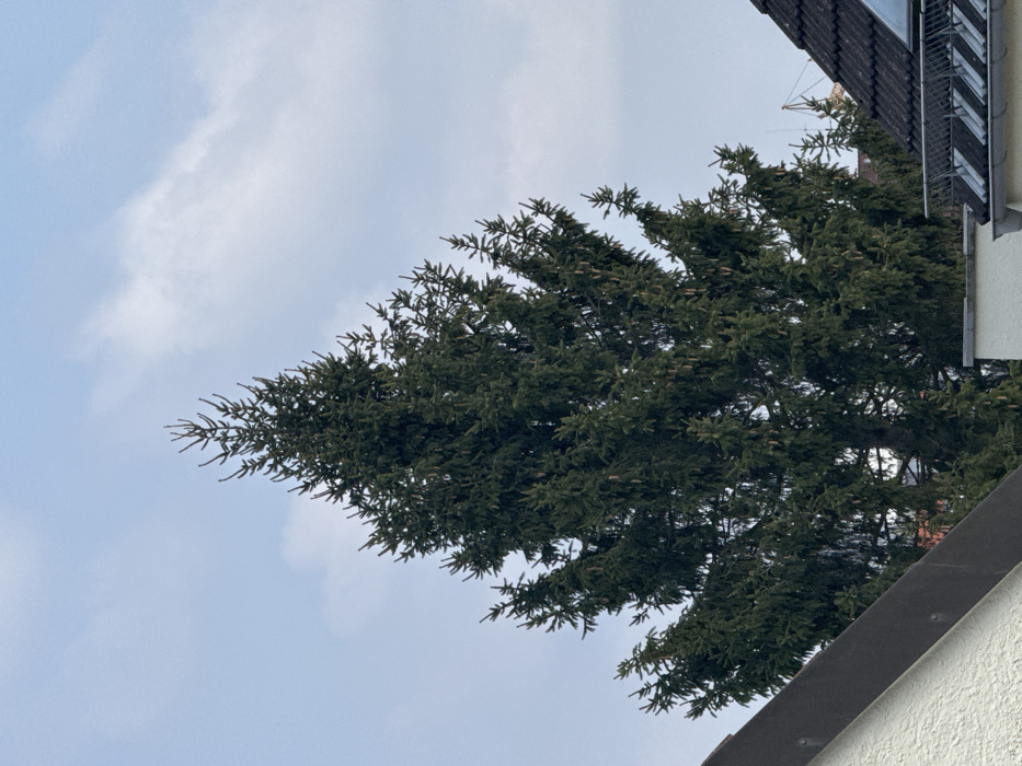 A large, mature evergreen tree, consistent with a spruce, dominates the central and upper frame, exhibiting dense, dark green foliage and numerous brown cones. The background is a light blue sky with scattered white cirrus clouds. Portions of residential structures are visible in the foreground. In the lower-left, a section of a white stucco building wall and a dark brown sloped roofline are present. In the lower-right, a dark grey tiled roof, possibly a dormer with an integrated window, is situated above a white building facade featuring a dark metal railing. A smaller evergreen tree is visible beyond the right roofline, with an indistinct light-colored structure or antenna faintly visible in the far background. No people or animals are present, and no specific actions or interactions are depicted. The scene is situated in an urban or suburban setting within Augsburg, Germany.