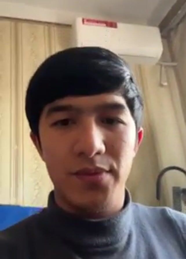 person with short black hair, wearing a gray turtleneck sweater, looking at the camera. The background includes patterned wallpaper, a white air conditioning unit, and part of a blue object. The camera appears to be held at a slightly downward angle. The person remains relatively still throughout the video.