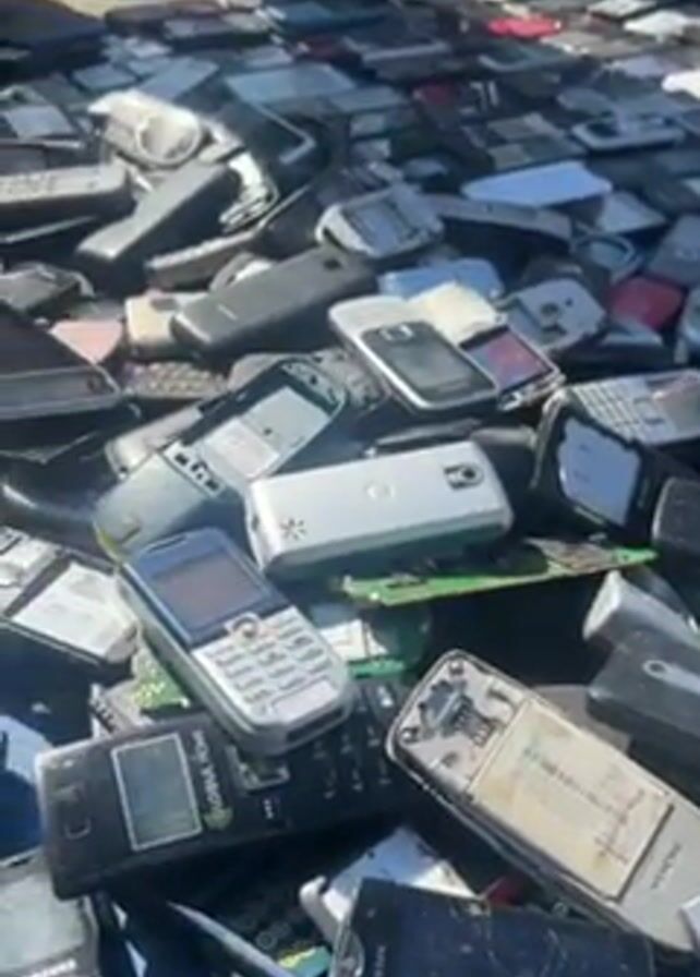 A video depicts a large, disorganized pile of old and broken cell phones. The phones are various models and brands, including Nokia, Samsung, and Sony Ericsson. Many phones are missing parts or have damaged screens. The phones are lying on a surface that appears to be a blue tarp or sheet. The scene is captured in daylight, giving good visibility of the items. The phones seem to be scrap or e-waste.