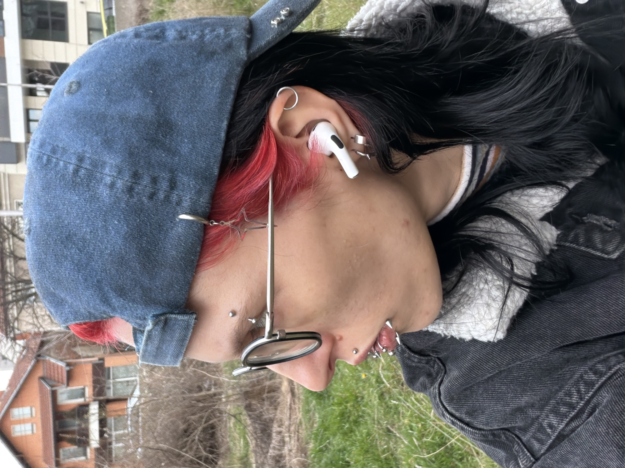 A person is depicted in profile, facing left, positioned outdoors in Sofia, Bulgaria. The individual, appearing to be a young adult, wears a blue denim baseball cap backward, adorned with silver studs on the brim and a silver star charm earring suspended from the cap. Their hair is split-dyed, featuring vibrant red on top and black underneath. Silver-framed round glasses with black accents are worn. The left ear holds a white Apple AirPods Pro earbud and is augmented with multiple silver piercings, including helix and conch hoops, and lobe jewelry. The face exhibits numerous silver piercings: a barbell on the eyebrow, a barbell on the nose bridge, a stud on the left nostril, a philtrum stud, and multiple rings and spiked studs adorning the lower lip. The subject wears a black denim jacket with a visible white sherpa lining over a striped top. The background features green grass in the foreground, transitioning to sparse, bare deciduous bushes. In the mid-distance to the left, a two-story orange/terracotta house with a red tiled roof, windows, and a balcony is visible. To the right, a modern multi-story building with dark windows and a light facade stands, with yellow tape faintly visible in the far distance. This scene is consistent with a mixed residential area within Sofia, characterized by a blend of older traditional homes and contemporary urban development, possibly on the city's periphery or in a transitioning neighborhood.