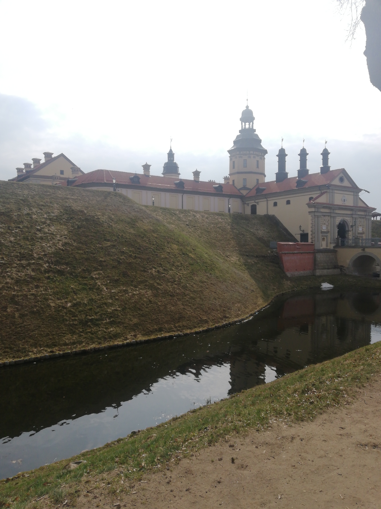 The image displays an exterior view of the Nesvizh Castle complex in Nyasvizh, Belarus, observed from across its surrounding moat under an overcast sky. In the foreground, a dark, still body of water, identifiable as the moat, reflects the bright sky and portions of the castle structure. A narrow dirt path with sparse green grass runs along the bottom right, adjacent to the water. Rising steeply from the far bank of the moat is a large, earthen embankment, covered in brown and light green grass, dominating the mid-left section of the image. Above the embankment, the main castle complex is visible. It features light yellow-cream colored walls, red-tiled gabled roofs, and numerous dark chimneys. A prominent, multi-tiered tower with a light yellow base and a dark, spired dome is positioned left of the image center. To the right of this tower, a grand stone entrance gate, characterized by arched openings and decorative stonework, spans a multi-arched bridge over the moat. A distinct red, rectangular structure is observed at the base of the bridge on the castle side. Several historic-style lampposts are affixed to the castle walls. The upper portion of the frame is occupied by a uniformly bright, overcast sky. Bare tree branches are partially discernible against the sky in the upper right corner. No individuals or active subjects are present in the scene.