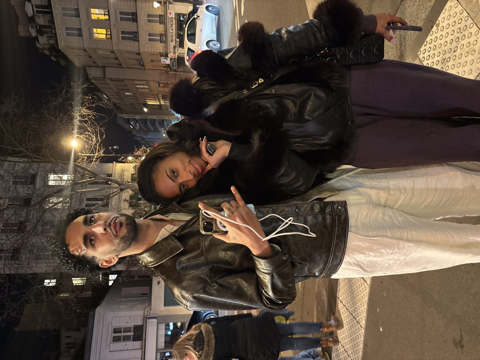 A man and a woman pose outdoors at night. The man wears a leather jacket over a light shirt, white pants, and holds a phone. The woman, behind him, dons a fur-trimmed leather jacket with dark pants. Buildings line the background. A car is seen partially. Street lighting illuminates the scene. Another person wearing a fur-trimmed jacket is also present, though less prominent.
