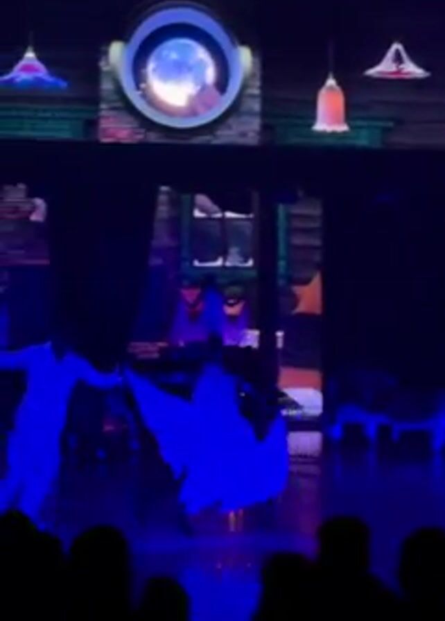Two dancers, silhouetted in blue light, are performing on a stage in front of a darkened audience. The backdrop appears to be a stylized house facade, with a circular window showing a full moon. Hanging lights, and furniture is visible inside the house. The lighting on the stage is primarily blue, with some accent lights. The stage floor has a glossy finish, reflecting the blue light.