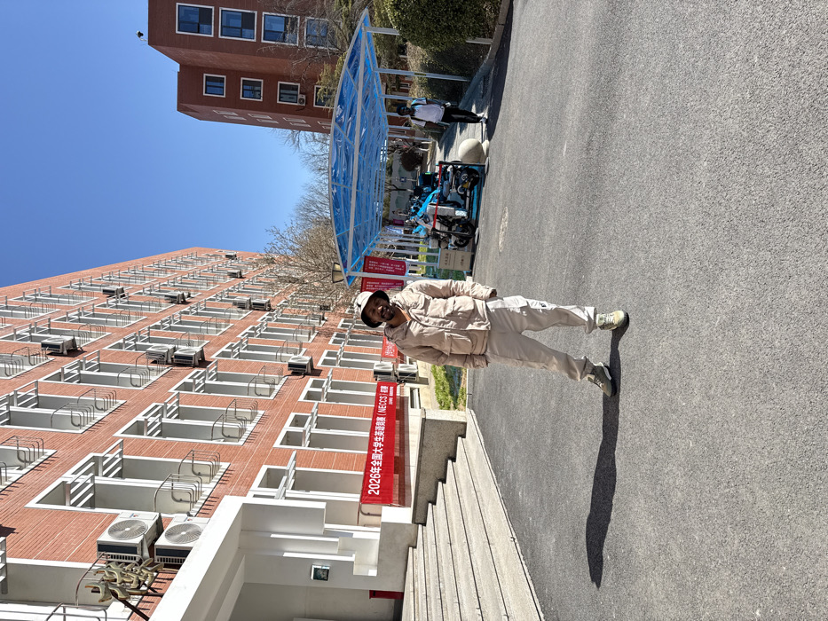 An outdoor daytime photograph depicts a university campus environment in Daxing District, China, under a clear blue sky