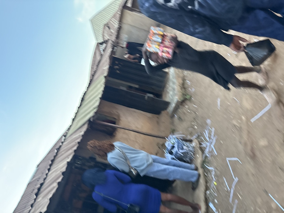 The image depicts an outdoor street scene in Rafin Par, Nigeria, under a bright, clear sky. The ground is unpaved reddish-brown earth, extensively littered with numerous white, thin paper or plastic strips. In the midground, from left to right: * Two individuals, seen from behind, stand near a building. The leftmost individual wears a form-fitting blue dress with dark hair and carries a dark shoulder bag. The adjacent individual wears a light-colored long-sleeved top and light blue jeans, with a light-colored cross-body bag. * Between these two individuals and the building, a dark blue or black cylindrical container is visible, filled with what appears to be shredded paper or debris. * Further to the right, a young individual, likely a child or adolescent, is captured in motion, wearing a dark-colored dress. This individual carries a stack of multi-colored packaged items (resembling snacks or drinks) balanced on their head, with both hands raised to steady the load. Their bare feet are visible as they move across the dirt path. In the immediate foreground on the right, a partial view of an individual is visible, including a dark-clothed arm holding a black plastic bag and a portion of a dark-clothed leg, indicating movement. The background features several single-story structures with walls constructed from unpainted materials, possibly mud or concrete, in varying shades of brown. These structures are topped with corrugated metal roofs, exhibiting different states of wear and color, from rusty brown to a dull green. One structure nearest the two women has an open, dark doorway. Further back, additional buildings with light-colored corrugated roofs are visible against the horizon. The overall scene suggests a bustling, informal commercial or residential area.