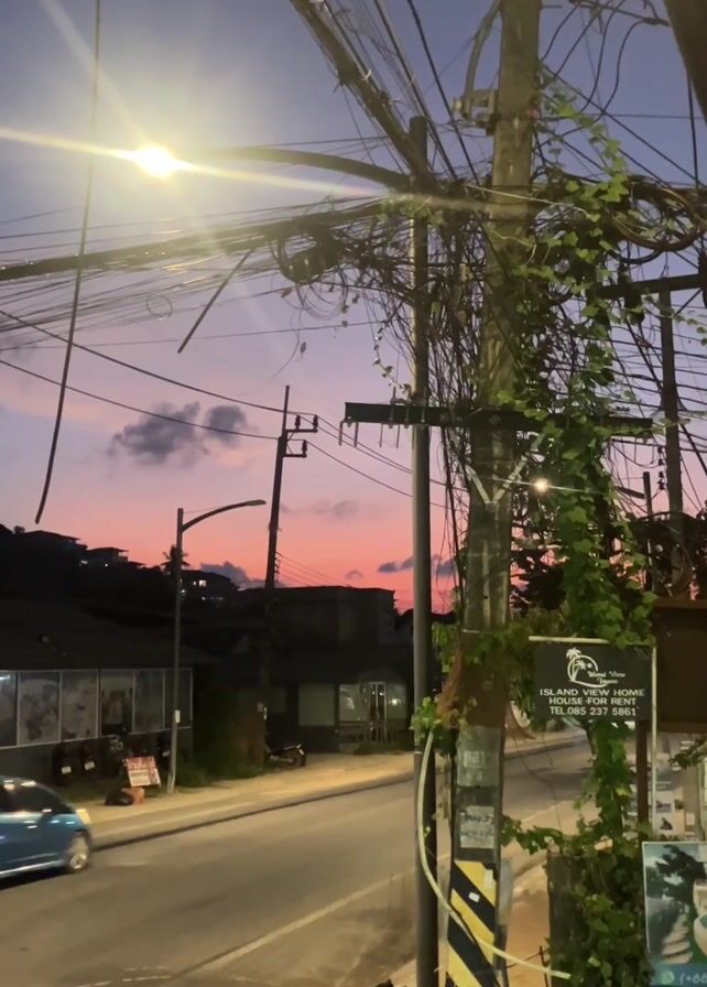 street scene at dusk. The sky is a mix of pink and purple hues. A utility pole laden with wires dominates the foreground, with vines growing up it. A sign is attached to the pole, advertising “Island View Home” for rent. A blue car drives down the street, followed by a white car. Trash bags are piled at the base of the utility pole. Buildings are visible in the background. The street is lit by a streetlamp.