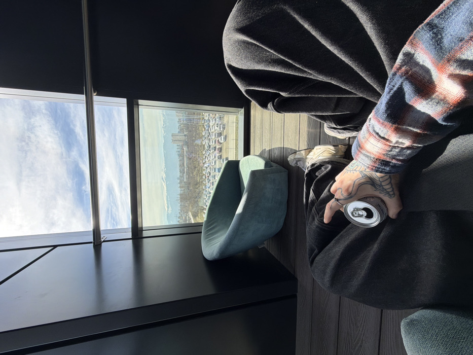 From an interior vantage point in Busmantsi, Bulgaria, a person is seated, their lower body and left arm visible in the foreground. The left hand, adorned with extensive tattoos, holds an open silver beverage can labeled "L-CARNITINE." The person wears dark trousers, a red and blue plaid long-sleeved shirt, and light-colored athletic shoes. To the immediate left, an unoccupied teal upholstered armchair rests on dark wooden floorboards. The interior features dark, angular wall panels and large windows extending to the ceiling. Through the large windows, bright sunlight illuminates a sprawling outdoor parking lot filled with numerous vehicles directly below. Beyond the parking lot, a city skyline with buildings is visible, and in the distant background, snow-capped mountains rise under a partly cloudy blue sky. A silver horizontal bar is present across the upper section of the window frame.
