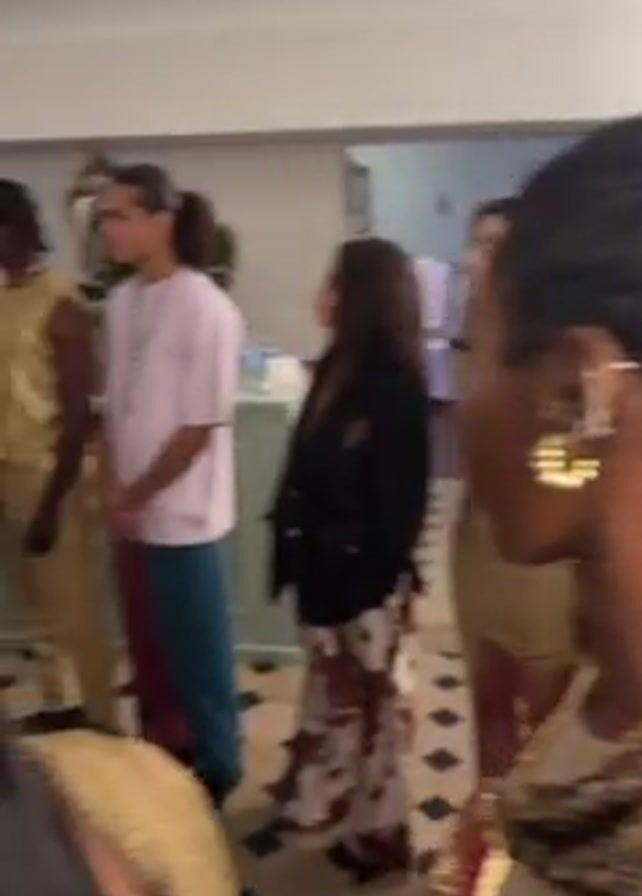 The video depicts a gathering of people in a brightly lit room, potentially at a social event