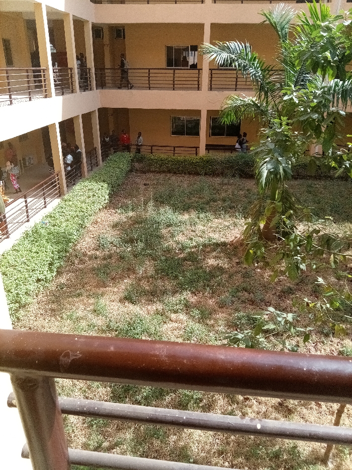 Captured from an elevated perspective, an interior courtyard is surrounded by a three-story building. People are seen on the balconies. The courtyard features dense green shrubbery along its borders and sparse grass and small plants covering its center. A sizable tree, partially obscuring the building behind it, stands to the right. A brown metal railing is in the foreground. The building is light brown.