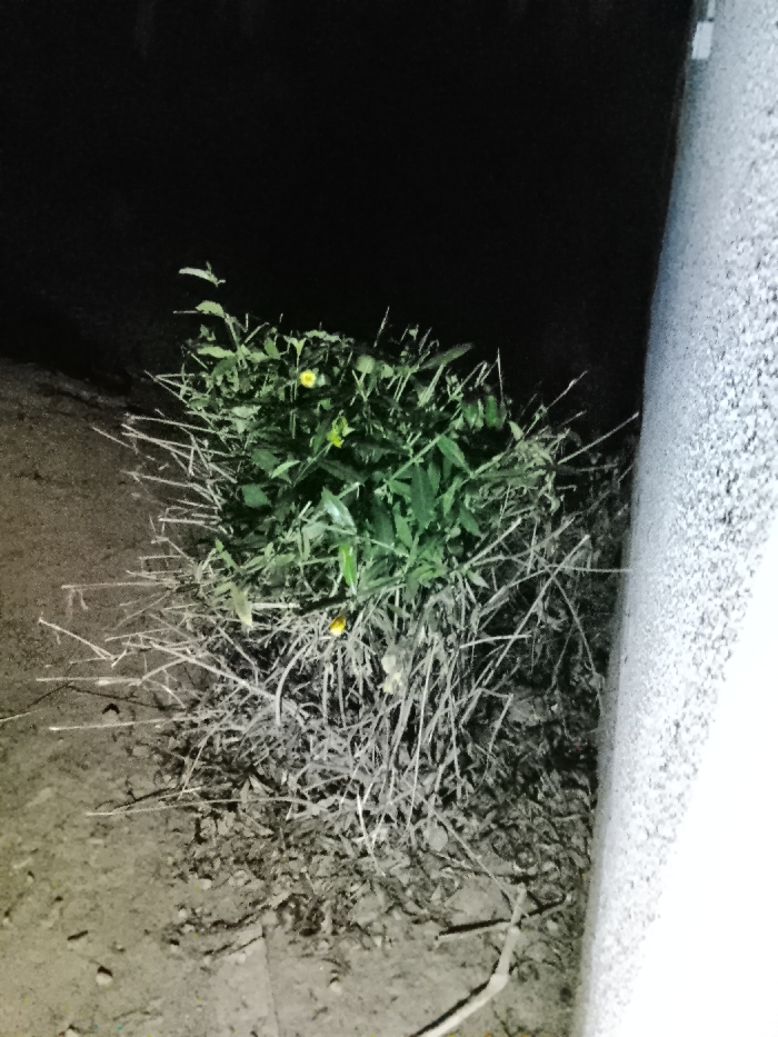 A bush with green leaves and a few yellow flowers grows out of dry, twiggy undergrowth. The scene is dim, almost dark, illuminated slightly from the left, revealing dirt on the ground. A bright, textured white surface is to the right, possibly a wall or side of a building. The background is completely dark.