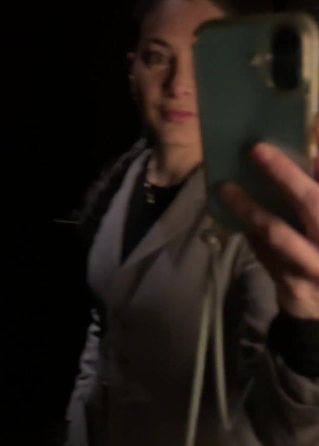 A person holds a phone up to a mirror and takes a selfie. The person is wearing a grey top and a black shirt underneath, and has dark hair pulled back. The phone is light blue. The person then pans the camera toward the window, revealing a nighttime cityscape below, full of lights.