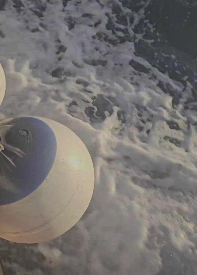 The video starts with a close-up shot of white fenders bobbing in foamy water, presumably alongside a moving boat