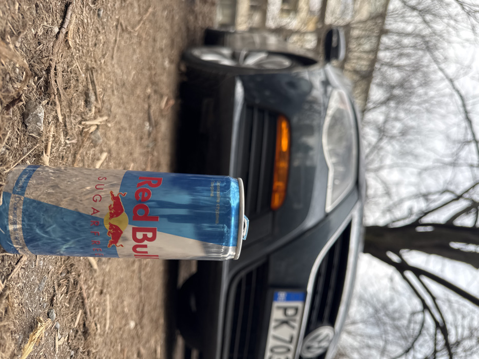 A partially consumed Red Bull Sugarfree energy drink can stands upright on dry, brown soil containing small twigs and stones in the immediate foreground. The can displays its silver and blue design with red "Red Bull" text and a visible open tab. In the blurred background, a dark gray Volkswagen vehicle is parked. Its front grille, headlights, and a Bulgarian license plate reading "PK 7036" are discernible, indicating the Pernik region, consistent with a location in or near Sofia, Bulgaria. Behind the vehicle, bare deciduous tree branches are visible against an overcast, light gray sky. A blurred building structure is present in the far left background. No individuals are present.