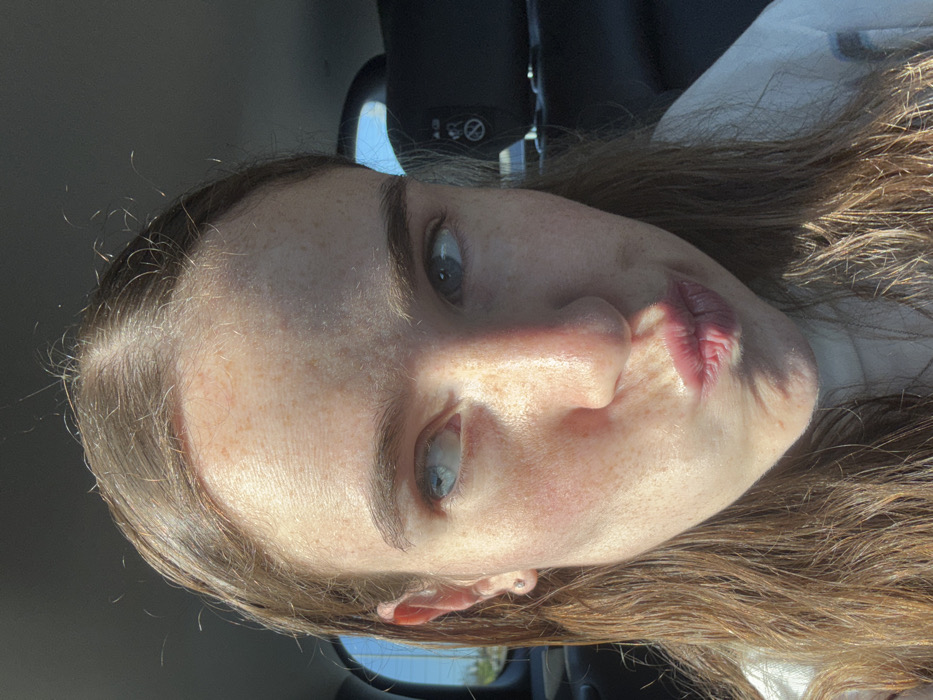 A close-up, waist-up portrait of a female individual is captured within a vehicle interior. The subject, possessing light brown hair with visible flyaways, exhibits numerous freckles across her forehead, nose, and cheeks. Her left eye (viewer's right) is rolled sharply to the left, revealing a prominent portion of the sclera, while her right eye (viewer's left) also glances to the left. Her lips are pursed forward in a "kissing" or "duck face" expression, and a small stud earring is visible in her left ear. She is wearing a light-colored, possibly high-collared garment. The background consists of a dark car seat headrest with a white emblem on the right, and a sunlit window on the left, revealing a blue sky and a light-colored structure or ground outside. Strong natural light illuminates the left side of her face and hair, casting shadows on the right. The specific location within the city of Azor, Israel, is not discernible from the visual information provided in the image.