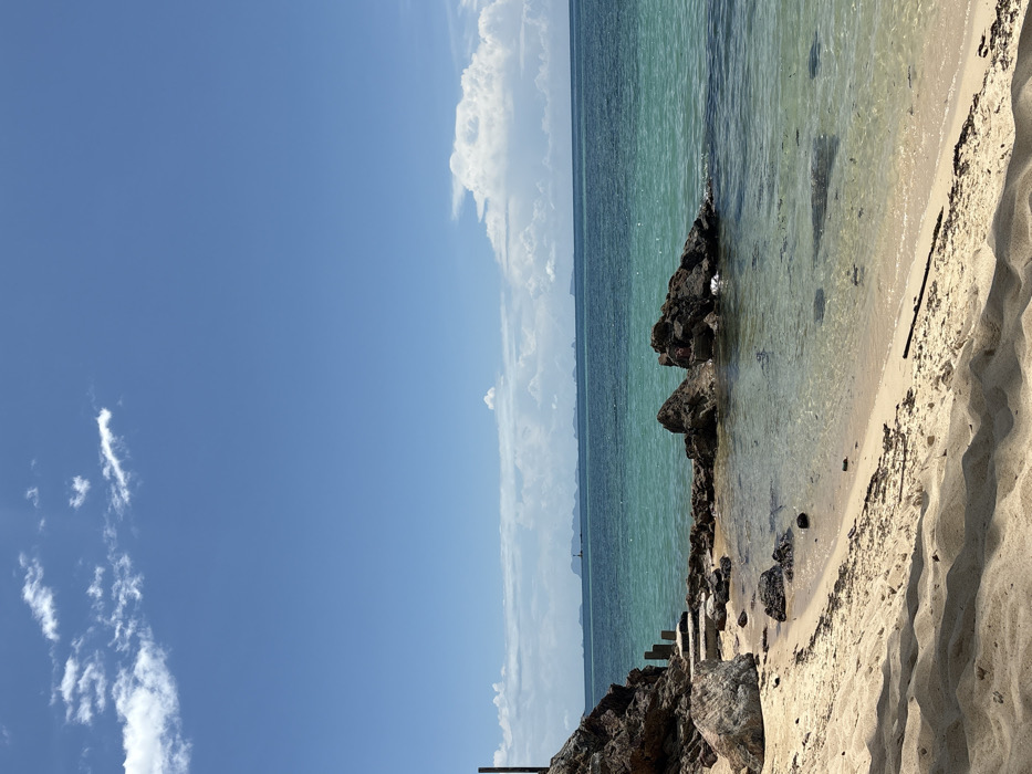 The image depicts a daytime coastal scene at Baan Sri Thanu, Thailand. The sky is predominantly clear blue with scattered white cumulus clouds. The foreground consists of light beige sand, showing ripples and scattered dark organic debris. To the left, a rocky outcrop or small cliff face borders the beach, with several dark brown rocks and a series of three vertical wooden posts embedded near its base. The ocean water exhibits two distinct color zones: a clear, shallow aquamarine near the shore, transitioning to a deeper blue further out. Submerged dark, jagged rocks are visible in the shallow water, notably a cluster in the mid-ground. The clear water allows visibility of the sandy and rocky seabed. On the distant horizon, multiple small landmasses, likely islands, are visible beneath a band of white clouds. In the mid-distance on the water, slightly left of center, a dark, slender vertical structure, resembling a buoy or a small navigational aid, stands above the water surface. No human or animal subjects are present.