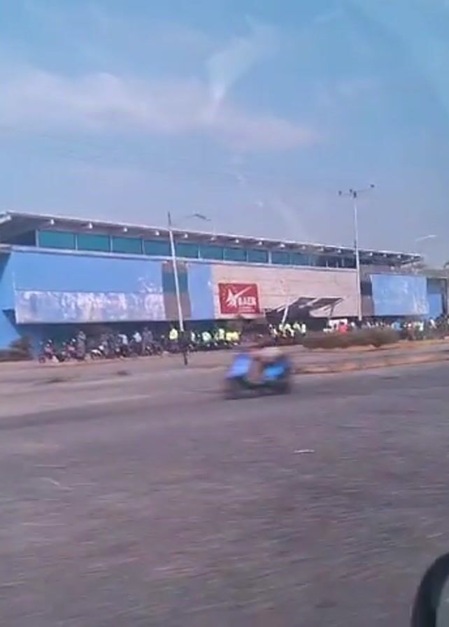 The video, shot from inside a vehicle, shows a blue building labeled "BAER" on the other side of a street. There are a large number of people in front of the building, mostly wearing yellow vests. Some of them are standing or walking around. There is a motorcycle with a rider passing in front of the building. A black car is passing by in the foreground. The sky is blue with some clouds. The reflection from the car window partially obscures the view.