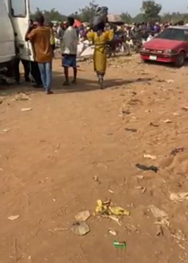 The video captures a bustling outdoor scene with a dirt ground covered in trash. A white van is parked on the left side of the frame, and several men stand around its back. Further back, a crowd of people mill about, with a red car visible towards the right. A woman wearing a yellow dress with black polka dots walks towards the crowd, carrying something on her head. The overall impression is that of a crowded, possibly disorganized, marketplace or public space.
