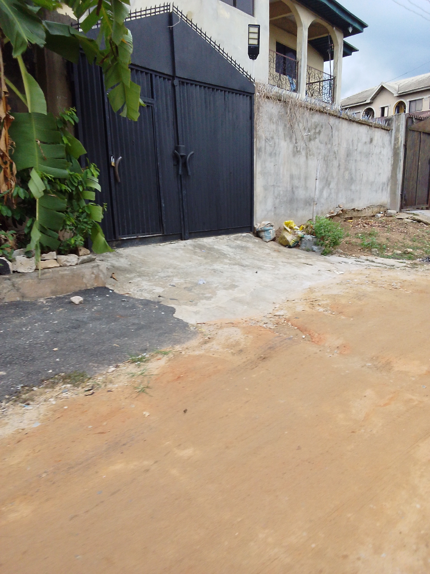The image presents a street scene in Aba, Nigeria, featuring a walled compound with a large, black metal gate. To the left of the gate, a banana plant grows. The compound wall is constructed of concrete and is topped with what appears to be razor wire. Bags of materials are piled against the wall near the gate. The ground is a mix of concrete, asphalt, and reddish-brown dirt, suggesting a partially paved road. The sky is overcast. Buildings are visible in the background. The scene is static with no people visible.