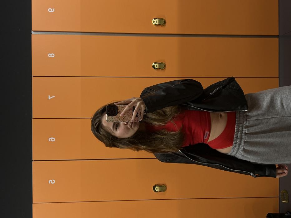 The image depicts a young adult female taking a mirror selfie in a locker room, identified as being in Krasnoyarsk, Russia. The background consists of a row of bright orange lockers featuring brass-colored elliptical handles and white Cyrillic characters ('г', 'э', 'т', 'е') and the numeral '8' as identifiers. A dark trim runs along the top of the lockers, and a dark floor is visible at the bottom. The subject is a young adult female with long, wavy dark brown hair, parted to her left. She holds a light-colored, patterned smartphone in her right hand, partially obscuring her face, specifically her right eye and nose. Her visible left eye is directed towards the camera lens in her reflection. Her expression is neutral. She wears a red high-neck cropped top, revealing her midriff, and high-cut red bottoms with a distinctive cutout design on the left hip. Light grey drawstring sweatpants are worn over the red bottoms, covering her legs from mid-thigh down. A black unzipped faux leather jacket is draped over her shoulders, covering her arms and most of her torso. A faint yellow object is partially visible on the dark floor in the lower left corner. The scene is evenly lit by artificial overhead lighting.