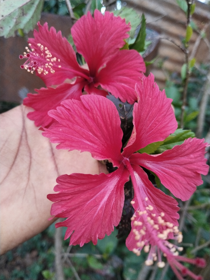 Two vibrant red hibiscus flowers dominate the scene, their petals exhibiting textured ridges. The stamens of each flower are distinctly visible, displaying a pale yellow hue. In the backdrop, blurred hints of greenery suggest foliage, while a portion of a hand appears in the lower-left corner. The overall composition focuses on the flowers, capturing their bright color and detailed texture against a soft, natural background.