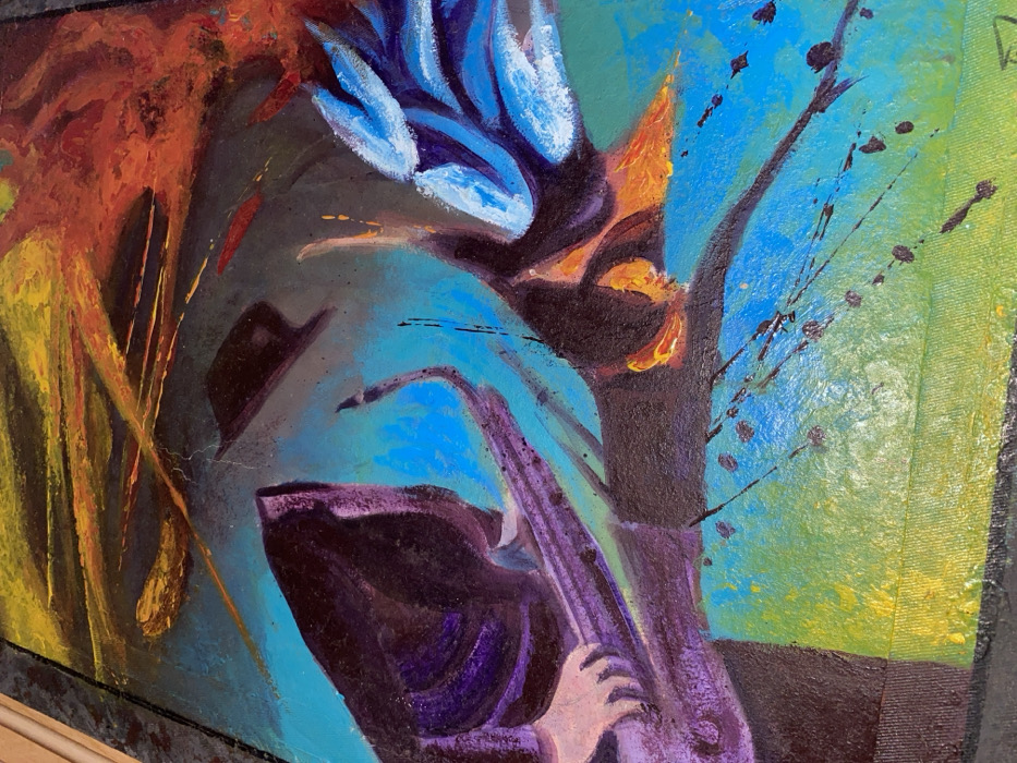 This is an abstract and surreal painting rendered in vibrant acrylic or oil on canvas. The dominant color palette features deep blues, purples, fiery oranges, yellows, and dark browns. In the upper section, streaks of intense yellow and orange-red suggest dynamic energy or flames against a dark, turbulent background. A dark, fedora-style hat is depicted floating, tilted, in the upper-center void. The left-mid section features a dark purple-hooded figure, partially obscured, with a pale-skinned hand gripping a long, dark purple, curved object resembling a saxophone or a stylized staff. The background in this area is a vivid teal-blue. To the right-mid section, an amorphous dark brown form, highlighted with bursts of orange and yellow, appears in dynamic motion. Extending from this form is a structure composed of distinct white and light blue, feather-like elements, suggesting a wing or a stylized appendage. The lower portion of the painting transitions to a textured surface displaying horizontal bands of bright teal, green, and yellow, possibly representing a ground or stage. Black paint splatters are scattered across the lower blue and green areas. The depicted scene is an abstract and surreal composition, not visually identifiable as a specific physical location within the city of Jos, Nigeria.