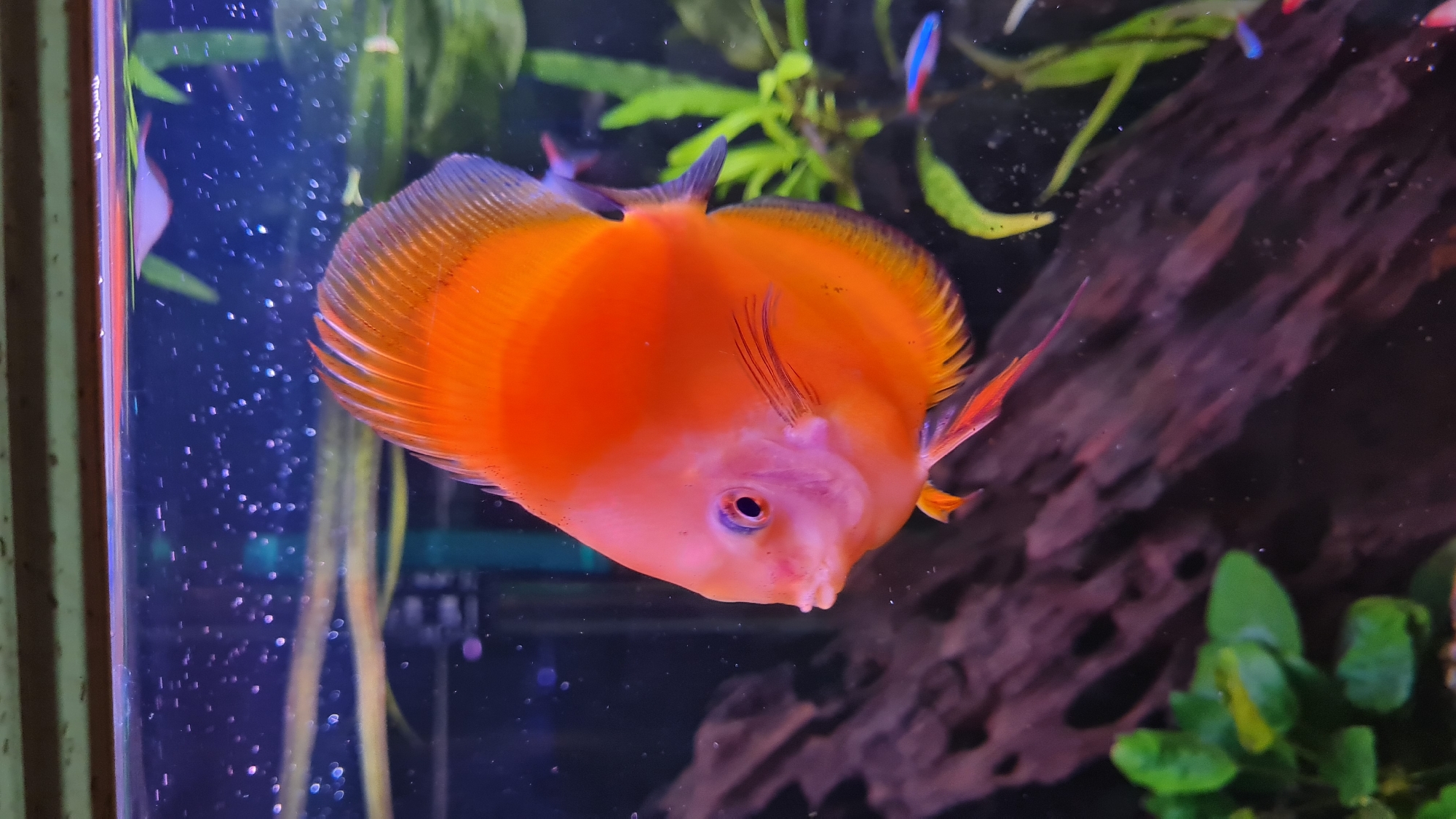 The image displays an underwater scene within an aquarium. A large, vibrant orange discus fish (Symphysodon species) is centrally positioned, facing left. The fish exhibits a disc-shaped body with prominent, fanned dorsal and anal fins that feature a darker, possibly purple or blue, edging. Its eye is reddish-pink with a dark pupil. Small, dark, particulate matter is visible on the fish's body and fins. In the background, a large piece of dark brown, gnarled driftwood is visible on the left and extends towards the bottom right. Green aquatic plants are present to the right and lower left. Several smaller fish, identified as neon tetras due to their iridescent blue and red lateral stripes, are swimming in the mid-ground and background. Numerous small air bubbles are suspended throughout the water column, with a higher concentration near the top surface of the water. The upper edge of the aquarium tank structure is visible at the top of the frame. The specific location within Lachish Regional Council, Israel, is not discernible from the provided image.