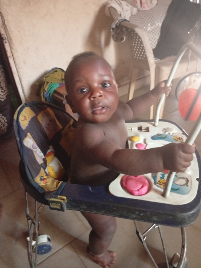 A shirtless baby stands in a walker. The baby has dark skin and is looking directly at the camera with a slightly open mouth. The walker is blue and has a colorful fabric seat. There are toys on the tray of the walker. In the background, there is a chair with clothes draped over it. The room appears to be simple and modestly furnished.